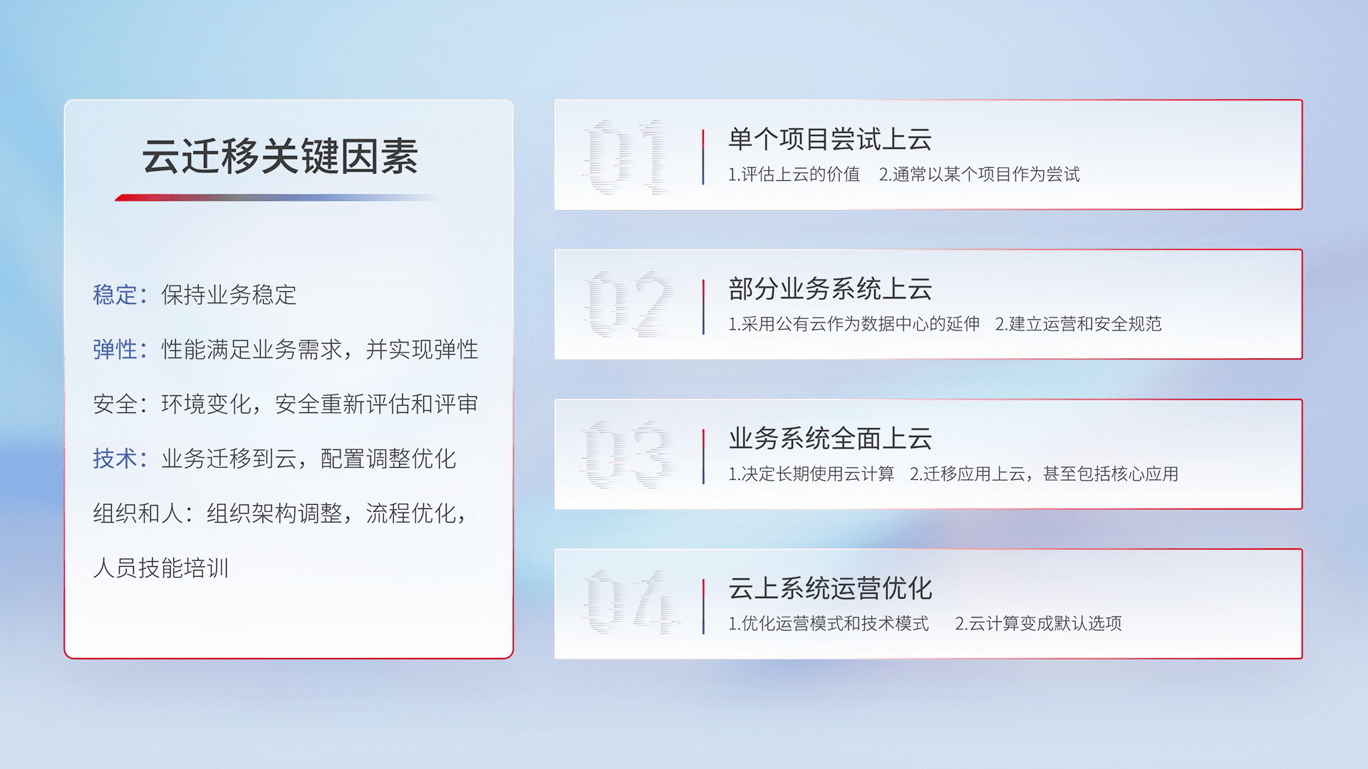 结合实际业务,,,从规划设计、、云平台选型、、云原生改造、、、、数据迁移、、集成交付,,迁移全过程为客户识别最佳上云路径,,,,做好风险识别管理,,设计网络架构、、、、身份权限、、安全审计合规、、、、操作审计、、、、日志审计、、监控告警策略、、、多站点容灾设计等,,对云上基础设施进行整体规划,,,提升IT治理水平,,,,以满足弹性、、、高可用、、、、高性能的需求。。。。
