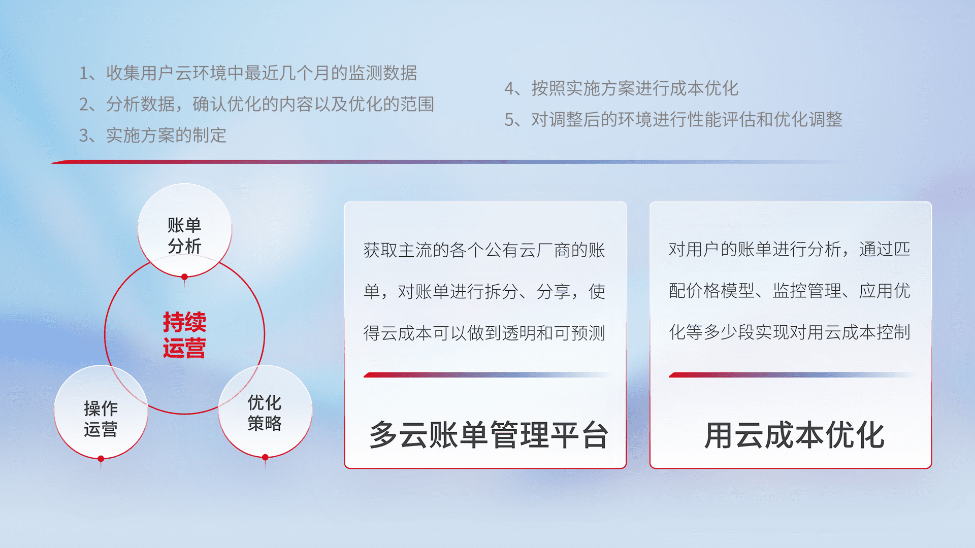 通过多云纳管,,以统一的资源数据模型把客户的云资源进行抽象和封装,,,进而实现对多云资源的统一操作,,,保障云资源管理的可靠性、、稳定性与可用性。。量身定制化运维内容,,,,配置、、、、开发运维、、、补丁管理、、备份、、、、监控、、认证和访问管理、、、审计和日常巡检等,,保障在用云过程中的可靠度,,,,稳定度以及高可用率。。